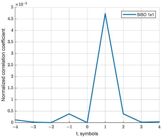 However, in practice, the true values of are unknown, which requires a different way to estimate the intrinsic interference. Obviously, when using the real PAM modulation, after eliminating the influence of the channel, the imaginary part of the symbol estimate will consist only of the imaginary part of the intrinsic interference ; therefore, it can be easily defined in the receiver as . In [7], it was first established that for the single-input–single-output (SISO) channel, there is a correlation between the real part of and the imaginary part of , where is a nonzero time shift. Thus, knowing the imaginary part of the interference and the correlation between the real and imaginary parts, it becomes possible to estimate the real part. To do this, we define the unnormalized correlation matrix between the real part of () and the imaginary part of () for the given channel as: