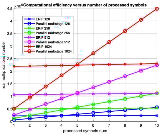 ERIP and parallel multistage computational efficiency versus number of processed symbols and subcarriers.