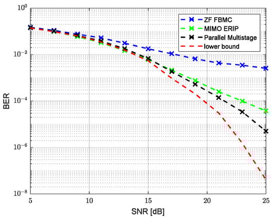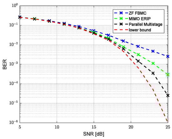 Modeling was performed for two channels’ parameter combinations, corresponding to an HF low-latitude channel with quiet conditions (HFLQ) and a high-latitude channel with quiet conditions (HFHQ). The first channel model corresponds to two beams with equal average power and a delay between beams of 1 ms. Figure 7 and Figure 8 show the dependence of the uncoded bit error ratio (BER) and the error vector amplitude (EVM) over the SNR, respectively, for the classic single-tap FBMC-OQAM ZF equalizer, MIMO ERIP equalizer, parallel multistage equalizer for the HFHQ channel model and the theoretical minimum for the case without the channel influence. Based on the presented dependencies, we can observe the close performance values of the MIMO ERIP algorithm compared to the parallel multistage equalizer, which, taking into account the lower computational complexity, makes the ERIP-based algorithm the preferred option for systems that are critical to the computational complexity of the implementation of the receiving path. The performance loss at high SNR values can be explained by the imperfect calculation of the real and imaginary parts of the interference correlation coefficient due to prototype filter ambiguity function truncation by one surrounding subcarrier and three surrounding symbols.
