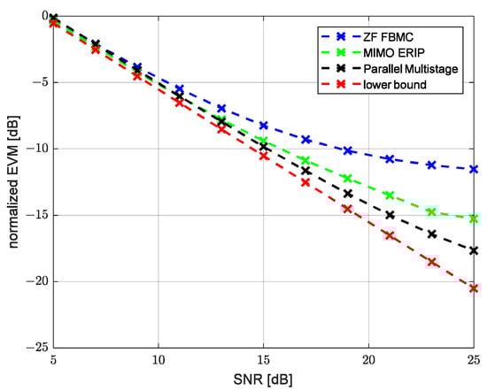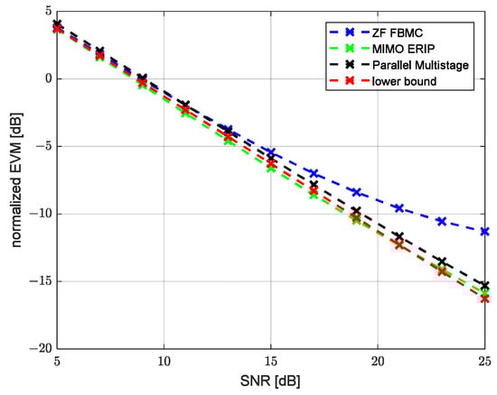 Figure 9 and Figure 10 show the dependence of the uncoded BER and EVM over the SNR for the same algorithms as in the previous case but in HFLQ channel conditions. For these conditions, the channel impulse response can be represented by two beams with equal power and a delay between them of 0.5 ms. The HFLQ channel has less difficult conditions, which explains the better performance of all presented algorithms, but we can see that the difference between MIMO ERIP and parallel multistage algorithms grows, which can also be explained by the growing impact of residual self-interference.