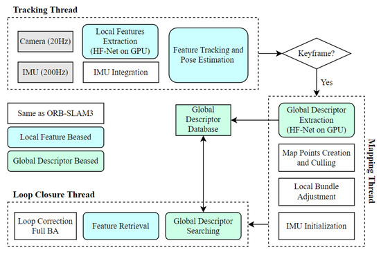 Compared with ORB-SLAM3, the distinguishing feature of HFNet-SLAM is that the local features (keypoints and corresponding descriptors) and global features are extracted from a deep CNN, HF-Net, instead of the traditional ORB and BoW methods. Therefore, some parts of the system, including feature extraction, keypoint matching, and loop detection, are customized for this modification.