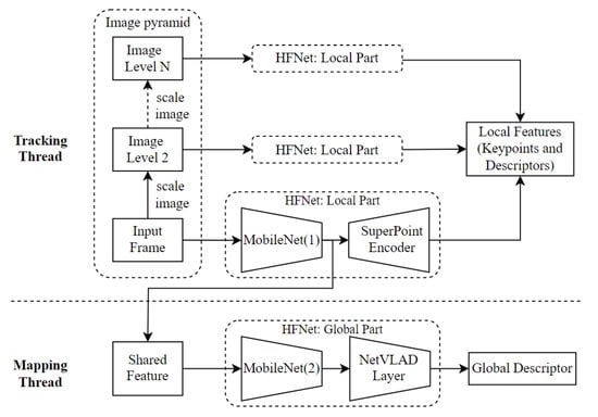 The global part of HF-Net, consisting of another MobileNet and a NetVLAD layer [37], is employed in the mapping thread for processing keyframes. The previously calculated shared features from the tracking thread are reused to obtain the global features for the input image.