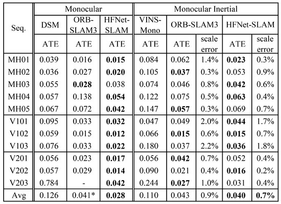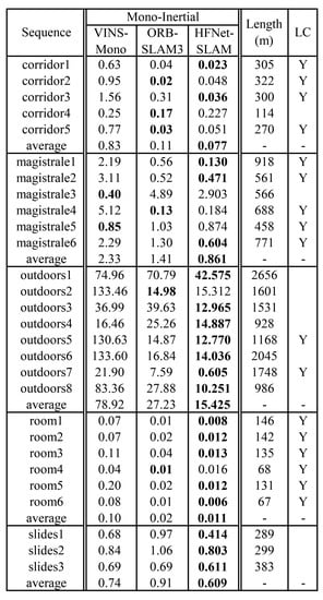 In this experiment, the HFNet-SLAM and other state-of-the-art systems are performed on the EuRoC [47] and TUM-VI [48] datasets to validate the overall accuracy and robustness. For each sequence in the datasets, the poses for all frames are evaluated by different SLAM algorithms. Then, the estimated poses are aligned with the corresponding ground-truth positions using Sim(3) transformation in the pure monocular case, and using SE(3) transformation in the visual-inertial case. After that, the rms ATE (absolute trajectory error) [49] is calculated as the evaluation metric to compare the performance of various systems. For the visual-inertial case, the scale errors are also calculated using s from Sim(3) alignment.