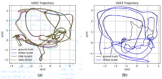 (a) Estimated trajectories in V202 sequence with monocular-inertial configuration; (b) Estimated trajectories in V203 sequence with pure monocular configuration.