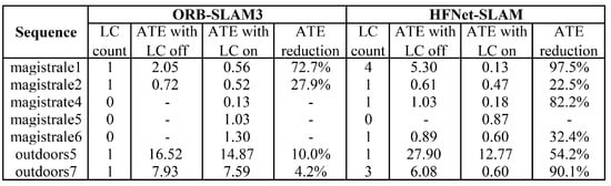 The comparison of loop detection modules in terms of the number of detected loops, the estimated ATE with and without loop closure, as well as corresponding error reduction (rms ATE in meters). The results are the median of five executions. The ATE errors with loop closure are provided by Figure 6.