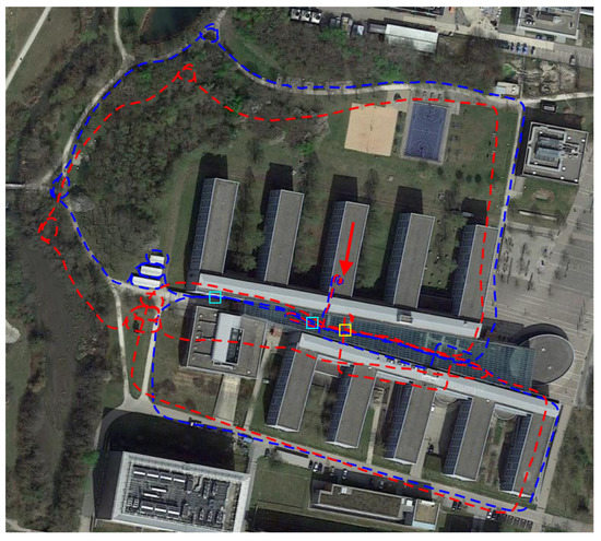 Estimated trajectories by HFNet-SLAM (blue) and ORB-SLAM3 (red) with the outdoors7 sequence from TUM-VI dataset. Yellow squares denote the places for loop detection by both algorithms, while cyan squares denote the places for loop detection only by HFNet-SLAM. The red pointer points to the start and end of trajectories according to the ground truth data.