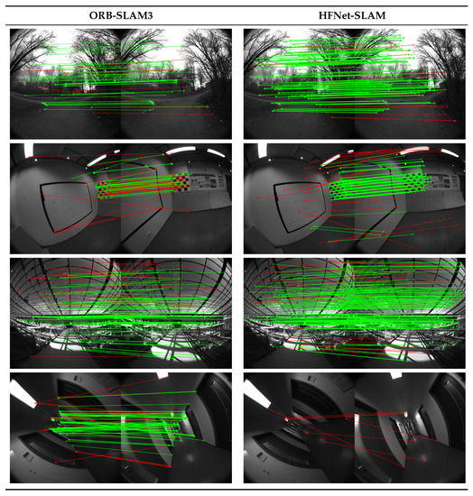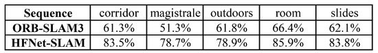 Secondly, the high quality of local features in HFNet-SLAM leads to accurate pose estimation. Figure 9 and Figure 10 compare the performance of feature matching using ORB-SLAM3 and HFNet-SLAM in various environments during the evaluation. The matches with reprojection errors higher than 6 pixels are regarded as outliers. As can be seen, both algorithms have the highest matching precision in room sequences. However, as the environments get more complex, the precision significantly decreases in magistrale and outdoors sequences. In general, the tracking strategy of HFNet-SLAM tends to generate dense correspondences with high correctness in various environments. These results confirm the findings from both Sarlin et al. [16] and Tang et al. [32], which report that deep learning-based features have a higher matching score than hand-crafted algorithms. Excellent feature tracking provides sufficient and accurate pose estimation information and dramatically reduces the median ATE. This commonly occurs in some long sequences without loop closure. Despite errors in the order of 10–42 m in these sequences, HFNet-SLAM still has the best accuracy in large environments.