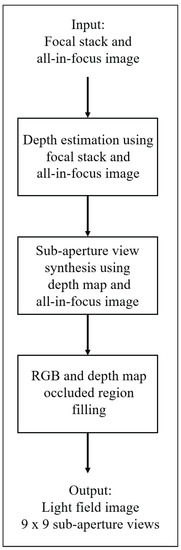 The methodology presented in this paper exploits the characteristics of focal stack images and the all-in-focus image to generate a light field image with an angular resolution of 9 × 9. The 9 × 9 resolution is chosen to have the same angular resolution and the images in the dataset; thus, the accuracy of the algorithm can be calculated for the entire light field image. The flow of the algorithm is represented in Figure 1. As shown in Figure 1, the methodology can be divided into three main stages: depth estimation, sub-aperture view synthesis, and RGB and depth map filling for occluded regions.