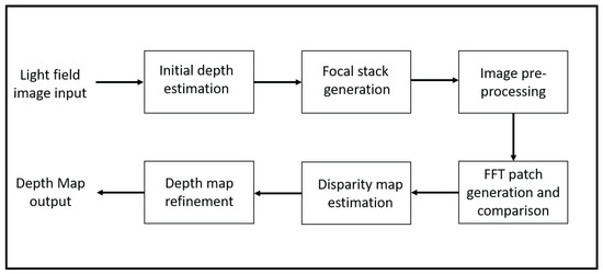 We exploit the characteristics of focal stack images to generate a disparity map that is used to synthesize the light field image. The flow of the depth estimation algorithm is shown in Figure 2. Our algorithm uses the concept of depth from defocus by a one-to-one comparison between each focal stack image and the central all-in-focus image. This estimation approach is also noise-resilient and outperforms the current state-of-the-art benchmark algorithms in the presence of noise [5]. Note that the below only provides an overview of our depth estimation approach; more details are presented in our previous publication [5]. There are other algorithms such as [32,33,34,35] that use stereo matching for depth estimation, but there are two main reasons why we do not compare our depth estimation approach to these algorithms. First, this paper focuses on light field synthesis using focal stacks as they can be used to extract the information used to fill the gaps in the synthesized sub-aperture views. Second, these techniques use sub-aperture views, which are difficult to capture using a 2D camera without physically moving the camera; in contrast, focal stacks can be captured by only adjusting the focal point of the camera lens.