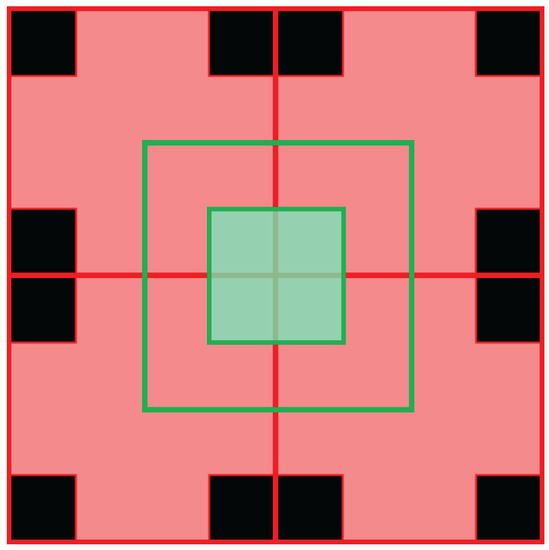 The focal stack images from the previous stage are divided into smaller image patches, with the individual patches then compared with the corresponding patches in the all-in-focus image. For depth estimation, we use the two patches of size 4 × 4 pixels as shown in Figure 3, the squares outlined by red and green lines. The results for depth map accuracy with different window sizes showed that smaller window sizes covered the image regions and boundaries more accurately. We can also reduce the patch size to lower than 4 × 4 pixels; however, experimental tests revealed that using a patch smaller than 4 × 4 pixels does not improve the depth map accuracy and increases the computational time. Figure 3 shows the two 4 × 4 image patches in the red and green squares that are considered for matching. Since we use overlapping windows, we only use the pixels highlighted in the red square and green square for the depth map estimation as shown in Figure 3.