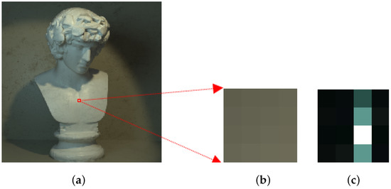 (a) Central sub-aperture image of a LF image, (b) a magnified 4 × 4 RGB image patch and (c) FFT of the image patch.