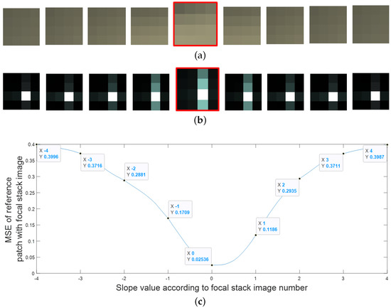 We compared the FFT of the image patches, so we no longer look at individual pixel values when comparing the image patches but a frequency domain representation of those patches, which makes the comparison more noise resilient. Figure 4 and Figure 5 illustrate the proposed approach. Figure 4a shows the central sub-aperture image of the LF image, and Figure 4b,c show a 4 × 4 pixel patch taken from the image and the FFT of the patch, respectively. The depth levels for the depth map depend on the number of images in the focal stack images. In Figure 5, only 9 refocused images are considered from −4 to +4 slope at an interval of 1. It is clearly seen that the FFT of the fifth patch in Figure 5 is the most similar to the FFT of the reference patch.
