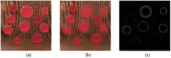 Filling the occluded regions in the RGB images is more complex than filling the occluded regions in the depth map, as the depth map values have only two possible values to choose from: the foreground or the background depth values. In our approach, the depth values and the focal stack images are used to estimate the pixel values for the gap generated near depth discontinuities. Due to the defocus blur in focal stack images, when focusing on the background, parts of the background are revealed that are not visible in the all-in-focus image. The amount of blur is also dependent on the depth difference between the foreground and background object. As the pixels in the sub-aperture images also move in accordance with their depth values, the focal stack image reveals the exact amount of information required to fill the gaps, as shown in Figure 8. Figure 8c is obtained by blurring the foreground objects by the amount equivalent to the depth difference between the object and subtracting it from the image focused on the background. However, since the induced blur can only approximate the lens blur, the extracted image region still contains the color tone of the foreground region.