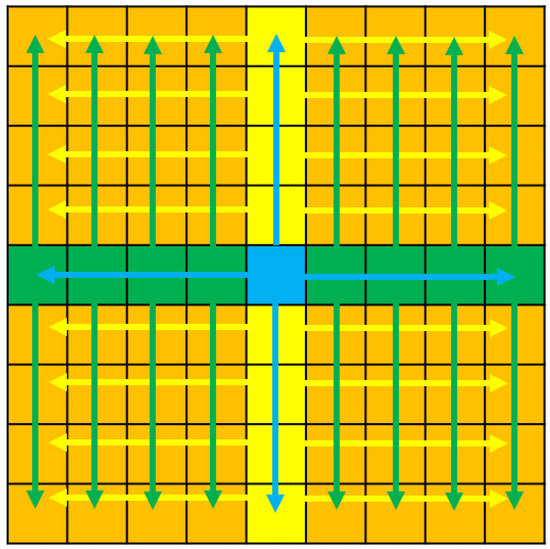 Figure 9 represents a light field image with an angular resolution of 9 × 9 views. The blue square represents the starting point for the proposed light field synthesis algorithm. We use the all-in-focus image and the estimated depth map to synthesize the central horizontal and vertical sub-aperture views, which in this depth map is represented by the green and yellow squares in Figure 9. Each of the generated central horizontal views and its corresponding depth map are then used to synthesize the sub-aperture views above and below the green squares, while each of the generated central vertical views and its corresponding depth map is then used to synthesize the sub-aperture views to the right and left of the yellow squares. All of the orange squares thus are synthesized using the central horizontal and vertical sub-aperture views, and its depth map is represented by the green and yellow squares. Both of the sub-aperture views generated from the horizontal and vertical views are then averaged as the final light field image.