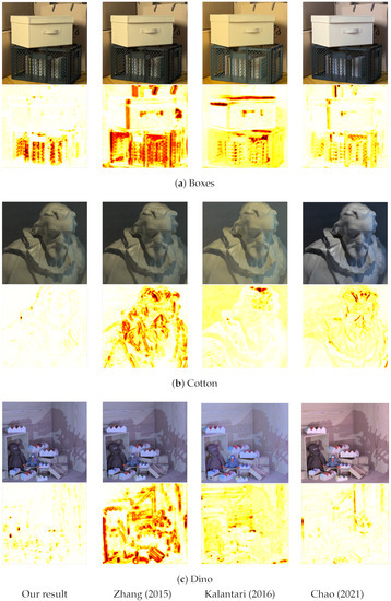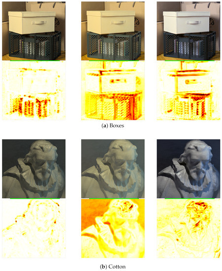 For the ‘Cotton’ image in Figure 12b, our results show similar high accuracy for the top left view as the horizontal view, where the algorithm can synthesize the image accurately for all the regions except at depth discontinuities. The PSNR and SSIM results shown in Table 6 show the accuracy to be 43.07 and 0.9925, respectively. For Kalantari et al. [21], we can see from Figure 12b that the background region in the image is synthesized inaccurately, as shown by the orange regions in the SSIM error map. Areas in the image with shadows near the neck and shoulder are also inaccurately synthesized. For Chao et al. [18], similar to the horizontal view, the structure of the eyes, nose, and hair appear to be shifted and superimposed on the image, making it appear blurred near those regions in the figure.