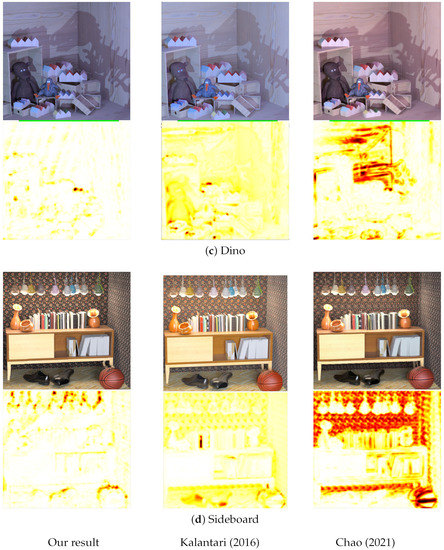 In the ‘Sideboard’ image in Figure 12d, our synthesized view shows errors in two regions in the image. As our depth estimation algorithm cannot distinguish the depth for thin objects, the ceiling wires on which the lights hang from are incorrectly synthesized. The other error is near the bottom of the image, where the legs of the sideboard appear distorted. Again, this is because the depth estimation algorithm misdetected the depth of the legs. For Kalantari et al. [21], we can see that the sideboard and the objects placed on the sideboard are accurately synthesized as these regions in the SSIM error map appear white, whereas all other regions appear yellow. For Chao et al. [18], the pattern of the wall and the objects placed on the sideboard appear to be blurred, which is again because it appears as a shifted image superimposed on the image.