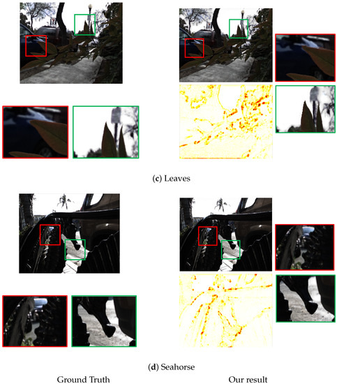 Figure 13 shows the visual comparison for the left-topmost sub-aperture image with the ground truth for four images from the 30-Scenes dataset [21]. Table 8 shows the PSNR and SSIM results for the four images shown in Figure 13 from the 30-Scenes dataset [21]. We have chosen these images as there is a significant depth difference between the foreground and background regions in these images. In Figure 13a, the tree’s bark covers part of the road and the car. It can be seen from the magnified images that the bark in the synthesized image shows no blurring around the edges near the road or the car, as seen in the red and green magnified images, respectively. The flower scene in Figure 13b consists of plants and trees in the foreground and cars, houses and a man in the background. The magnified images in Figure 13b show that the edges of the leaves are sharp, and even the bark with the house in the background is synthesized correctly. However, closer inspection of the image reveals that just to the left of the green magnification window, the edges of the window on the house in the background slant a little to the right. An error of the depth map causes this abnormality in the synthesized view. A similar aberration can be seen in Figure 13c in the magnified green window, but this irregularity is due to the incorrect filling of the occluded region of the image. This irregularity can also be seen in the SSIM map, highlighted by the dark red spots. In Figure 13d, the red magnification window shows no blurring effect near the seahorse’s snout, but if we look closely at the green magnification window, we notice that the gap between the seahorse and the chair handle is less than seen in the ground truth image. This is again due to an error with the depth map, as the car in the background or the seahorse is estimated at a slightly incorrect depth, causing the objects to appear closer.