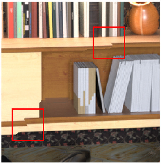In our approach proposed here, the number of depth levels in the depth map is dependent on the number of images in the focal stack. Thus, with fewer images in the focal stack, if an object in the image has two or more depth levels, the object shows an abrupt discontinuity in the synthesized view, as shown in Figure 14 (highlighted by the red squares). In our future work, we intend to use the focal stack images to estimate the amount of blur for the same defocus regions between consecutive focal stack images and use that information to increase the depth levels of the depth map. Increasing the depth levels using fewer focal stack images will reduce the effect of abrupt discontinuities for objects with two or more depths in the synthesized view, increasing the synthesized view accuracy with fewer focal stack images. In our future work, for light field synthesis using focal stack images captured by a 2D camera, we intend to compare our algorithm accuracy with RVS and VSRS view synthesis algorithms [38] that use DIBR.