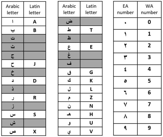Figure 3. Correspondence between Arabic and Latin letters, and between Eastern Arabic (EA) and Western Arabic (WA) digits in Saudi license plates. Letters that are not allowed on Saudi license plates are shown on a gray background.