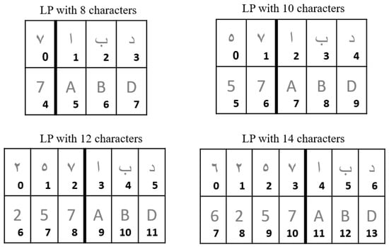 Figure 4. Example showing the possible number of characters on Saudi license plates. There are always three letters, but the number of digits varies from 1 to 4. Each letter is written in both Arabic (first line) and Latin (second line) characters, and each digit is written in Eastern Arabic (first line) and Western Arabic (second line) numerals. For later use, each character is marked with an index (CharID) representing its order from left to right and top to bottom.