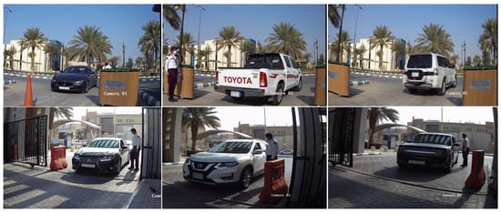 Figure 13. Sample images extracted from two videos for evaluating car model and license plate recognition. The images at the top are from video 1, which was recorded at the employees’ parking lot entrance, while the images at the bottom are from video 2, which was recorded at the main gate of PSU campus. As can be observed in this sample, the license plate characters are hardly readable on some frames.