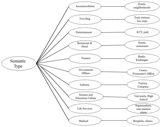 - The set of location semantics is constructed by the optimal location semantics selection algorithm based on the exponential mechanism and using the “geographic indistinguishability” mechanism to generate noise for the user’s location semantics. The semantic type in the location semantics is the semantic type that corresponds to the location after perturbation.