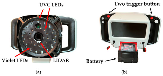 A commercially available instrument (CSI-D+; SafetySpect Inc., Grand Forks, ND, USA) was selected as test equipment for disinfection of microbiological samples. This instrument included 405 nm (violet) as a source for detection mode and 275 nm (UVC) wavelength LED arrays for the exposure during both detection and disinfection mode, and a light detection and ranging (LiDAR) module to determine the surface distance, as shown in Figure 1a. This device includes an RGB, a UV camera for image acquisition, and a display screen, as shown in Figure 1b. Appropriate personal protective equipment (PPE), such as safety goggles, was mandatory during all disinfection procedures.