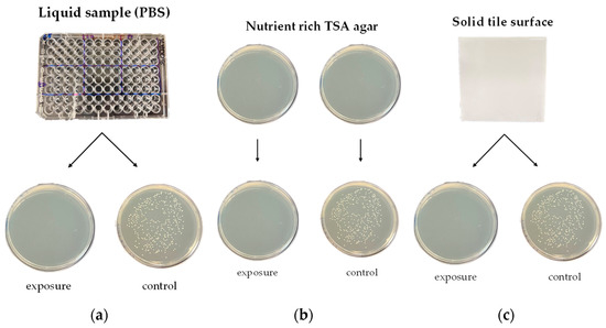 Three different growth environments tested in this study. (a) Liquid sample (PBS), (b) nutrient-rich TSA agar, and (c) solid tile surface.