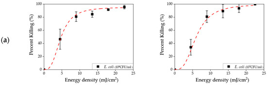 The disinfection results in nutrient-rich agar media (TSA media, red circle) and liquid sample (PBS, black rectangle) are shown in Figure 5. The killing rates are represented along with energy density increment, and the measurements were conducted at fixed concentrations (103 CFU/mL). It was shown that similar killing rates were achieved in each species and energy densities. Similarly, each effective energy dose used for E. coli, K. pneumoniae, S. enteritidis, L. innocua, and S. aureus was assumed to be greater than 20, 5, 10, 10, 10 mJ/cm2, respectively, in both PBS and TSA media. However, different killing rates were shown at 4.5 mJ/cm2 energy density in both conditions, such as 34.2% (PBS) and 49.5% (TSA) (Figure 5a), and 40.1% (PBS) and 22.6% (TSA) (Figure 5d). As shown in Figure 5 (a; E. coli) and (d; L. innocua), lower energy density resulted in a higher standard deviation of the killing rate due to a sub-optimal level of energy density.