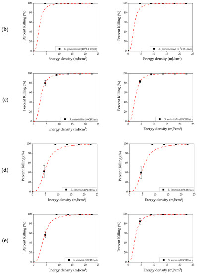 Killing rate as a function of energy density in a liquid sample for (a) E. coli, (b) K. pneumoniae, (c) S. enteritidis, (d) L. innocua, and (e) S. aureus. The left and right concentrations are 104 and 103 CFU/mL, respectively.