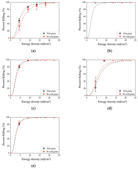 The disinfection results on the solid surface (tile surface, red circle) and in nutrient-rich agar media (TSA, black rectangle) are shown in Figure 6. These results were similar for PBS and TSA media; however, results for the tile surface showed a different regime. The killing rates were the same in the case of K. pneumoniae; however, the other species showed a higher killing rate in general when tested on tile surfaces rather than TSA media. For example, a 100% killing rate of E. coli and S. aureus was achieved at 13.5 and 4.5 mJ/cm2, respectively (shown in Figure 6a,e). In addition, it could also be seen that the killing rate was higher at 4.5 mJ/cm2 energy dose for E. coli and L. innocua.