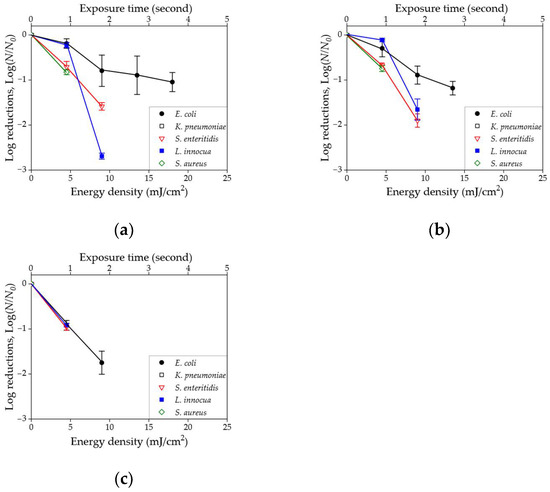 Figure 4 shows that the effective dose for disinfection varied depending on the type of bacterial species. First, K. pneumoniae colonies in various concentrations (106~103 CFU/mL) were completely removed by a dose of at least 4.5 mJ/cm2 (exposure time of 1 s). Second, it was shown that a 10.0 mJ/cm2 (exposure time of 2 s) effective dose could eliminate three species (S. enteritidis, L. innocua, and S. aureus). Third, E. coli had a relatively higher resistance to UVC than other species. As a result, an effective energy dose above 20.0 mJ/cm2 (exposure time of 4 s) was required for a bactericidal effect. In addition, it was shown that the influence of concentration on minimum effective dose was negligible in this energy density range (4.5–22.5 mJ/cm2). Only obvious improvement appeared at lower energy density, such as in Figure 4e at 4.5 mJ/cm2. The similar effective doses were also visually represented in Figure S1.