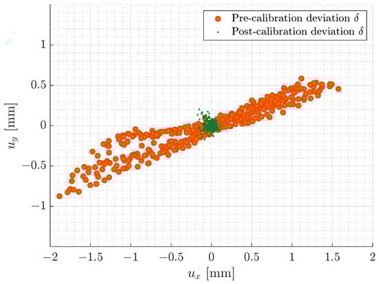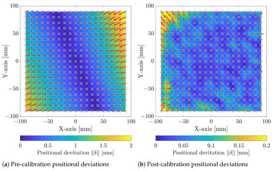 Figure 7a illustrates the scan field deviation in the pre-calibration state. It can be observed that the deviation is non-uniform and smallest at the centre of the workspace as it increases towards the edges of the scan field. This is expected and likely due to thermal effects or assembly defects, e.g., related to the mirrors and axes or the laser source, which are commonly identified as the most significant contributors to laser beam drift [