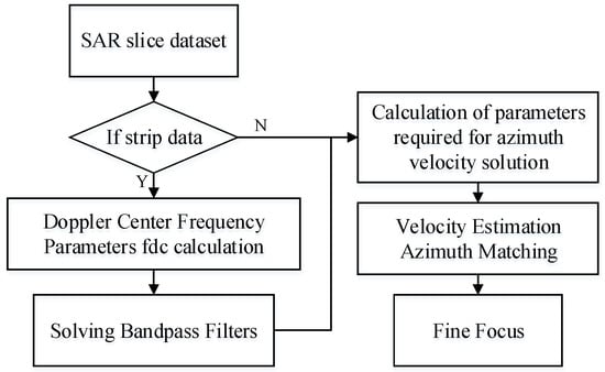 The proposed refocusing method uses a DCT approach based on azimuth velocity to refocus moving targets in SAR images that can be in either strip or scan mode. To meet the bandwidth requirements of the strip mode, a bandpass filter is included in the design. A flowchart of the dual-mode SAR imaging refocusing algorithm is presented in Figure 2.