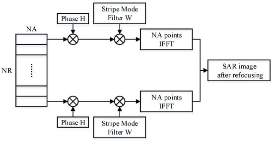 The proposed algorithm achieves fine focusing of the moving target through phase compensation, which is determined using the estimation of the azimuth velocity. The slice data are convolved with the corresponding phase data, and the response is complex multiplication on the spectrum. As shown in Figure 3, the strip mode needs to filter the slice data. Therefore, in the frequency domain, multiplication not only with the phase data, but also with the filter is required to achieve windowing in the time domain. The slice data are the frequency-domain complex data after Fourier transform.