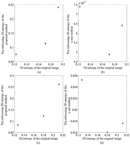 Figure 6 and Figure 7 show the one-dimensional and the two-dimensional entropy comparison diagrams before and after refocusing. It can be seen that the image entropy decreases after refocusing. The probability of the corresponding image grayscale value decreases, and the degree of aggregation increases. In the image, it is shown that the grayscale value in the area where the target is located is more aggregated. For comparison, the reduction of entropy value is more obvious after U-net convolutional neural network processing because the maximum value of grayscale is preserved.