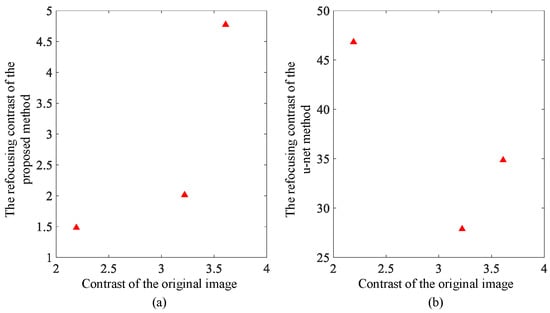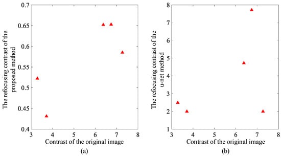 The image entropy and contrast of image data before and after refocusing are used to evaluate the effect of the proposed algorithm. The image entropy and contrast are calculated using Formulas (12) and (13). In the entropy calculation Formula (12), pi represents the gray-level probability in 1D. In 2D, pi represents the neighborhood gray-level relationship probability. Formula (13) calculates the contrast, in which δ(i, j) represents the gray-level difference of adjacent pixels, and Pδ(i, j) represents the probability of occurrence of the differences in gray level.