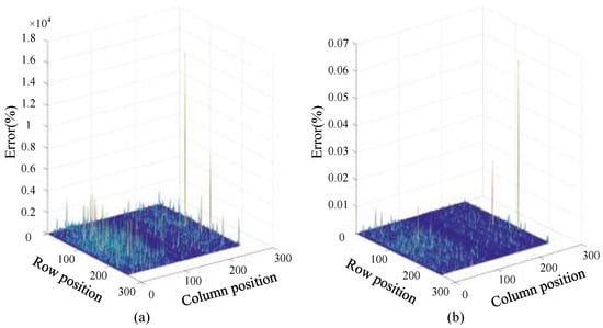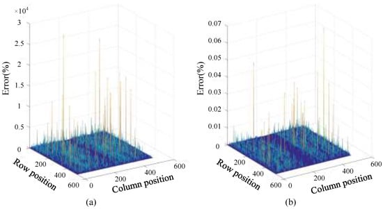 Data accuracy is a necessary design consideration when implementing algorithms in hardware. Usually, lower data precision can save hardware resources and computing time, but at the same time it can reduce the result precision. For the two modes, the precision and decimal storage mode of the data need to be considered. For the convenience of comparison, the test data are divided into three types: single-precision fixed-point numbers, single-precision floating-point numbers and double-precision floating-point numbers. According to the relative error calculation in the two modes shown in Figure 10 and Figure 11, it can be seen intuitively that in the choice between fixed-point numbers and floating-point numbers, the average value of the relative errors formed by fixed-point numbers has exceeded 100%, indicating that the data calculation is due to the fixed-point numbers. The characteristic of the limit of the number of points causes the data to generate overflow errors in the calculation and cause the calculation result to be wrong. In the relative error comparison between single precision and double precision, it can be seen that the maximum error does not exceed 0.1%. The number of digits required for data storage corresponding to single precision is 32, while that of double precision is 64. For the floating-point calculation IP encapsulated in the development platform, the floating-point calculation IP used by the Fourier correlation transform can calculate the data width. It cannot reach 64 bits, and in order to reduce the amount of data resources, the data type using single-precision floating-point numbers is finally selected for system operation in terms of hardware.