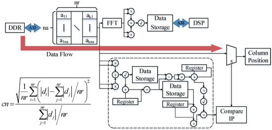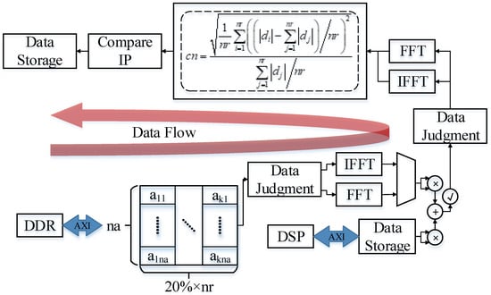 The proposed FPGA-based SAR imaging refocusing system adopts an “FPGA + DSP + external storage” and uses the slices of the target image to realize the refocusing of moving targets, as shown in Figure 12. The main control logic is responsible for data flow scheduling and module driver utilization for control. Through the identification of the status bits by the control module, the slice data in the DDR is read in the corresponding mode multiple times. Cooperate with calculation logic and RAM storage to realize parameter preparation, compensation phase calculation, and fine focus calculation functions in the algorithm model.