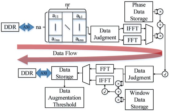 Phase compensation methods can be divided into two categories. The first category comprises scatter-based algorithms, such as phase gradient autofocus (PGA) [,,], which filters the data using the center offset and window and then estimates the error, but requires a larger window length and longer iteration time []. The second category comprises optimization algorithms, such as Doppler centroid tracking (DCT) [], maximum contrast (MC) [], maximum likelihood (ML) [], and minimum entropy (ME) []. Although DCT is robust with a low computation cost, it can produce significant errors when imaging multiple moving targets at the same time []. Both categories of phase compensation methods require only small sample data, which allows for cascaded end-to-end training and testing, and real-time updates of model parameters to accommodate variations in object size, speed, and orientation. However, both categories suffer from high algorithmic complexity, resulting in low efficiency [,]. To address this, field-programmable gate arrays (FPGAs) are often used to accelerate the algorithms.
