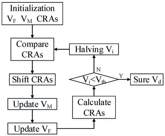 Since the method used is a velocity approximation estimation, it needs to be corrected and selected through comparison. In order to reduce the computational complexity and amount of calculation, this paper optimizes the algorithm for speed estimation to reduce the amount of calculation required. Ordinary comparison methods require a large amount of data to be constructed, and the number of comparisons is fixed according to the degree of data discretization and cannot be optimized. It is necessary to choose a faster comparison method. As a relatively common method in comparison search, the binary search method is optimized in terms of data calculation and comparison. Combining with a binary search method for speed estimation, a fast positioning search is performed by changing the speed interval, and the smallest data interval is used as the judgment condition for the end of the search. The specific calculation method is shown in Figure 22. Among them, VM is the main speed, which is determined according to the maximum value in CRAs. VF comprises two slave speeds, which are obtained according to the acceleration and deceleration interval of the main speed. CRAs is the matrix of contrast range azimuth, and its elements are calculated from the corresponding calculation of the main velocity and the slave velocity. Vi is the velocity interval. Vth is the minimum threshold of the speed interval. Vd is the final azimuth velocity to be obtained.