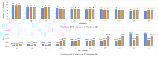 In the binary search method, two more critical parameters need to be limited. Respectively, these are the step size of the initial search interval, and the threshold interval for judging the end of the search. Adjust the initial step size and threshold according to the maximum speed of the moving target. The result of comprehensive training of the two modes using multiple images is shown in Figure 23. It is not difficult to see from the figure that when the initial step size is greater than 7, the number of cycle calculations experienced by the speed estimation tends to be relatively stable, and it is relatively smaller when the initial step size is 14, 21, and 22. Its corresponding calculation error is shown in the line chart below it. For these three initial steps, the threshold value is further analyzed, and the results are shown in Figure 24. It is not difficult to see that the smaller the threshold, the higher the accuracy of speed estimation, but the higher the number of calculations required. Comparing the calculation errors of the three initial step sizes horizontally, it is not difficult to see that the parameter combination with a threshold of 0.3 and an initial step size of 21 has certain advantages.