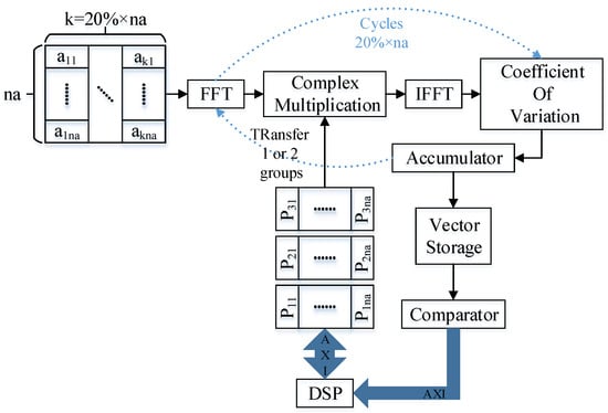 As shown in Figure 13, the parameter preparation state implements two functions in parallel. One function is to sort and filter data for azimuth velocity matching. According to the formula, the coefficient of variation solution module is designed, that is, the modular standard deviation is divided by the modular mean module, which is used to calculate the contrast range azimuth. The sorting part uses the encapsulated floating-point number comparator IP to realize the sorting function through different state jumps of the internal state machine of the sorting module. The transition of the state machine is designed according to the insertion algorithm model. Another function is to perform a Fourier transform on the slice data and realize the calculation of the Doppler center frequency and the calculation of the Taylor window required by the strip mode through DSP, and calculate the corresponding phase data for different moving target speeds for preparation. That is, the complex frequency-domain amplitude calculation after the slice data frequency-domain transformation is completed by FPGA. The calculation results are sent to the DSP according to the AXI protocol, and the complex Doppler center frequency formula calculation is realized through the DSP.