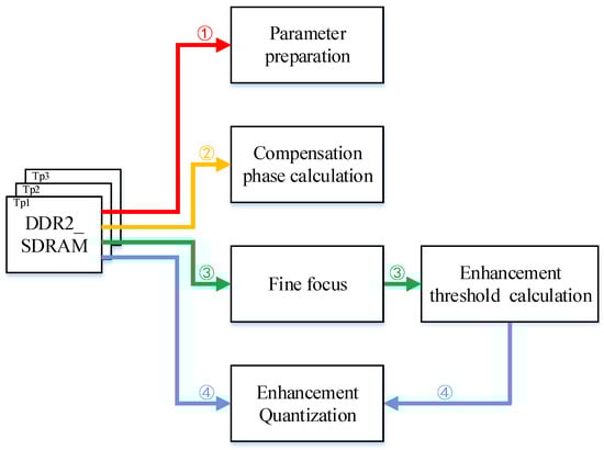 After adding the enhancement and quantization links in the previous section, the refocusing system will change from three states to four states. They are parameter preparation, compensation phase calculation, fine focusing, and threshold and enhancement calculation. According to the data flow rules, each part of the data driver needs to read the corresponding slice data from the DDR SDRAM for processing. However, the data threshold calculation is a preparatory work for the data enhancement calculation, and the data driver used to realize this part of the logic does not need to wait for the complete fine focus image result. After fine focusing and processing the data of each column, the data can be stored in parallel and sent to the enhanced threshold calculation part to start logic implementation. The calculation of the enhanced threshold is completed while achieving the fine focus of the entire slice. This approach reduces data interaction and improves computational efficiency. The specific state is shown in Figure 26, where the sequence of the data flow is labeled.