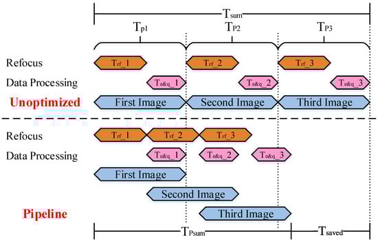 Assuming that we divide a picture into three data slices, Figure 27 shows the calculation time comparison between the general sequential implementation method and the optimized pipeline structure. It can be found that using the pipeline method, optimization can significantly reduce the calculation time. According to Table 1, which shows the timing comparison of each data flow, it can be seen that hardware processing has an advantage in computing speed. Implementing the pipeline operation in Figure 27, the data enhancement and quantization processing time after refocusing can also be optimized for all remaining slices except the last one. Therefore, the overall executing time is greatly reduced.