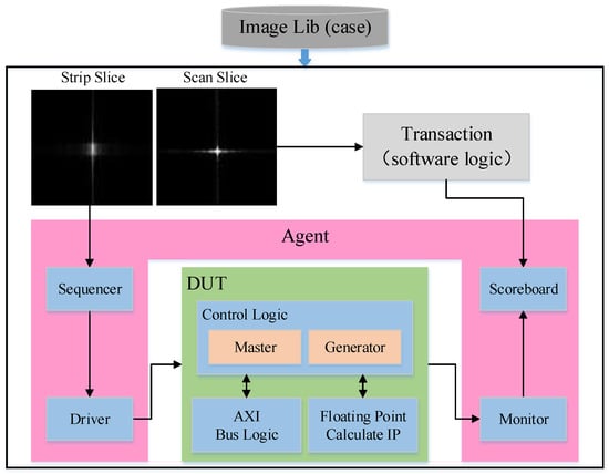 To test the hardware design function in accordance with the algorithm model and to simulate the data interaction between the host computer and the FPGA, a verification process was conducted. The overall functional simulation structure diagram is displayed in Figure 28, which simulates the construction method of the UVM verification platform. The verification process uses the original image data of both modes as the required case library. The sequencer and driver modules instantiated in the agent generate stimuli and send them to the DUT for logic reproduction. A monitor is used as a print record module for dynamic storage of output data. While reproducing the DUT, the image data are refocused through software logic. The instantiated scoreboard module is used to compare the data stored dynamically in the monitor with the software output results.