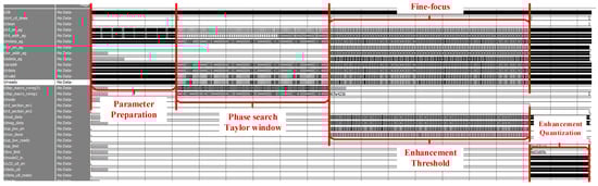 Combined with the overall data flow in Figure 26, the data processing logic can be divided into refocusing implementation and data enhancement quantization implementation according to the data-driven type. The input data required in refocusing are slice raw data. The data required for the realization of the data enhancement and quantization part are all fine focused data. We denote the realization time of single-slice refocusing as Trf, the time of data enhancement quantization as Teq, the time of processing a slice as Tp, and the time of processing the whole image as Tsum. According to Formula (16), the processing time of a slice can be obtained, and according to Formula (17), the processing time of a complete imaging picture can be obtained.