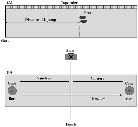 Schematic diagram of sports performance tests ((A) L-jump test, (B) Agility test).