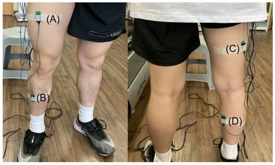 Locations of EMG sensors on the lower extremity ((A): Rectus Femoris, (B): Tibialis Anterior, (C): Biceps Femoris, and (D): Gastrocnemius Medialis).