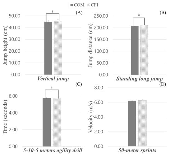 Sports performance measures from the benchmark commercial insole (COM) and carbon fiber insole (CFI). ((A) Vertical jump, (B) Standing long jump, (C) 5-10-5 m agility drill, and (D) 50-m sprints). Note. * indicates a statistically significant difference, and ‡ indicates a marginally significant difference.
